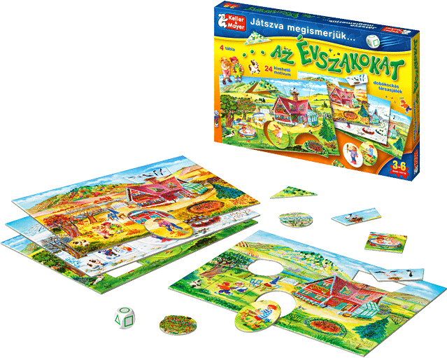 A különböző évszakokra jellemző tevékenységek, illetve a természet, a növények, az állatvilág jellemző képeit kell a játékosnak a megfelelő játéklapba illesztenie. Társasjátékként, vagy különböző nehézségi fokon egyszerű kirakós játékként is játszható.